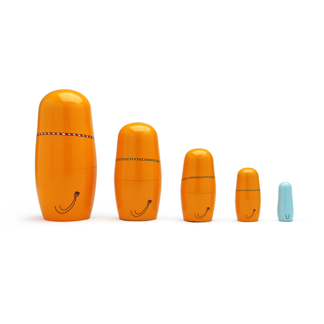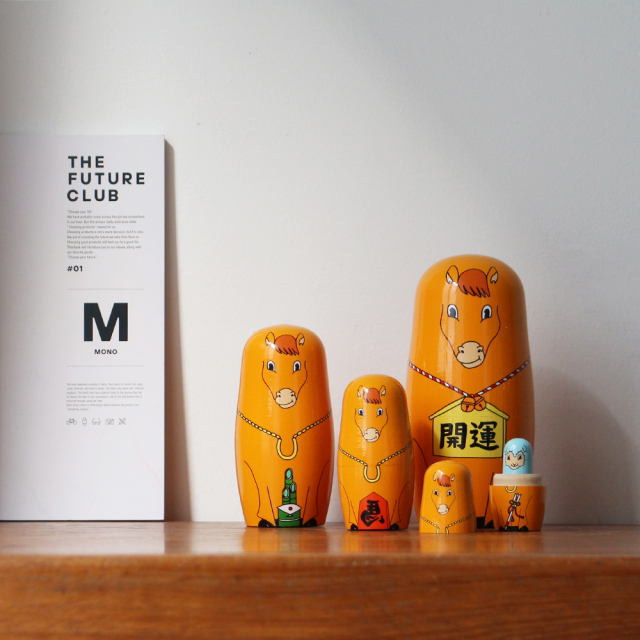 本体は上下半分で開くことができ、中から一回り小さな馬が出てくるギミック。ホースシュー、絵馬、左馬など縁起物を持った馬たちが新年を祝ってくれます。天然木ならではの暖かみがあり、大小5つからなるマトリョーシカはまとめて飾っても良し、バラバラに飾っても良しと様々なディスプレイを楽しむことが出来ます。