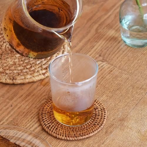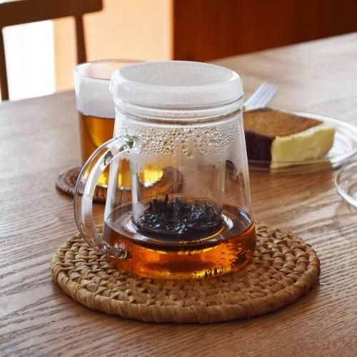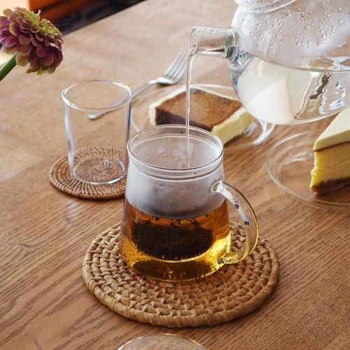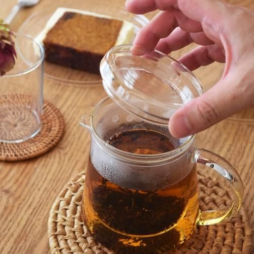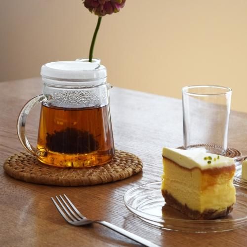 1~2人分のお茶を用意するのにちょうど良いサイズ感で、蓋、ストレーナー(茶こし)、ポットすべてのパーツがガラス製。紅茶やお茶の色、ゆっくりと茶葉が開く様子を目で見て楽しむことができます。また、フタを裏向きにするとストレーナーを仮置きすることができるので使い勝手も◎
