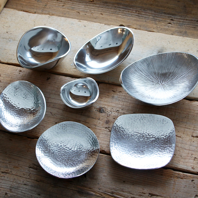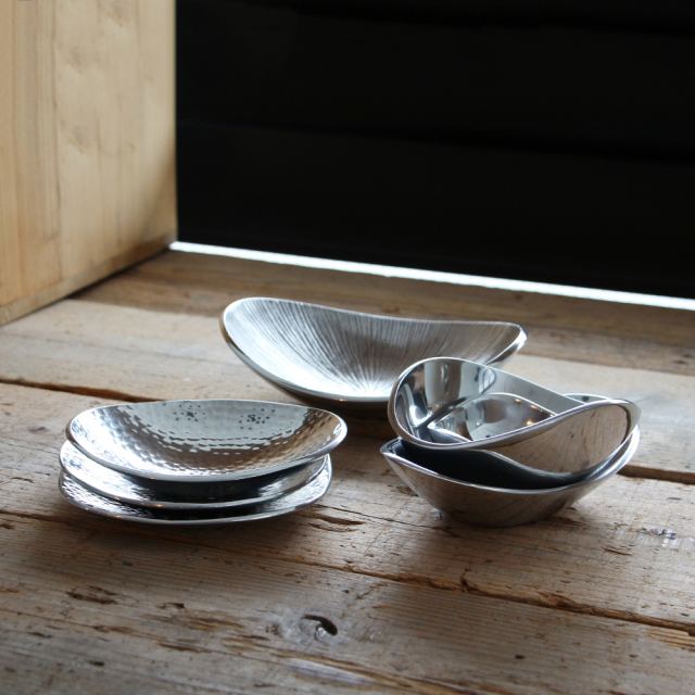 放射状に削りの入ったデザインのアルミトレイ。インドにてトラックや車の廃材から出るアルミを粉砕することでリサイクルして作られています。