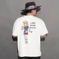 LUCKY LUDY氏らしい手描きの温もりと少しクセのあるキャラクター表現をベースに、アメリカンガールの装いにテキサスの愛称「LONE STAR STATE」を落とし込み、“OLD GIRL”としてヴィンテージ感と遊び心を軽やかに表現したデザイン。