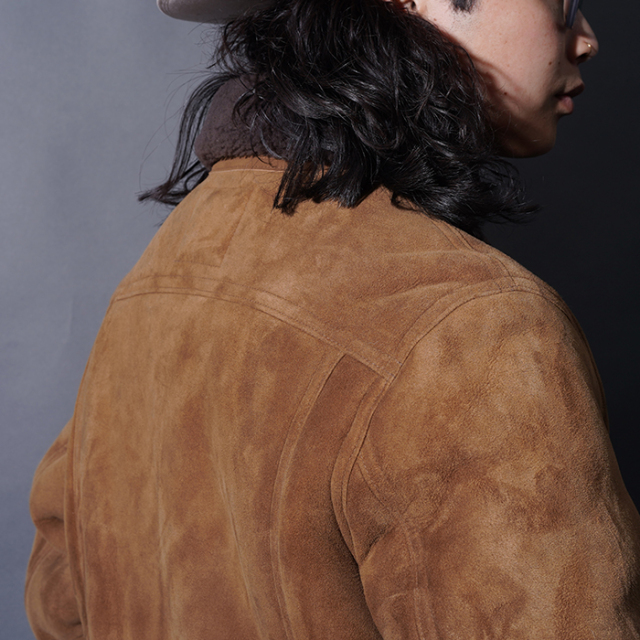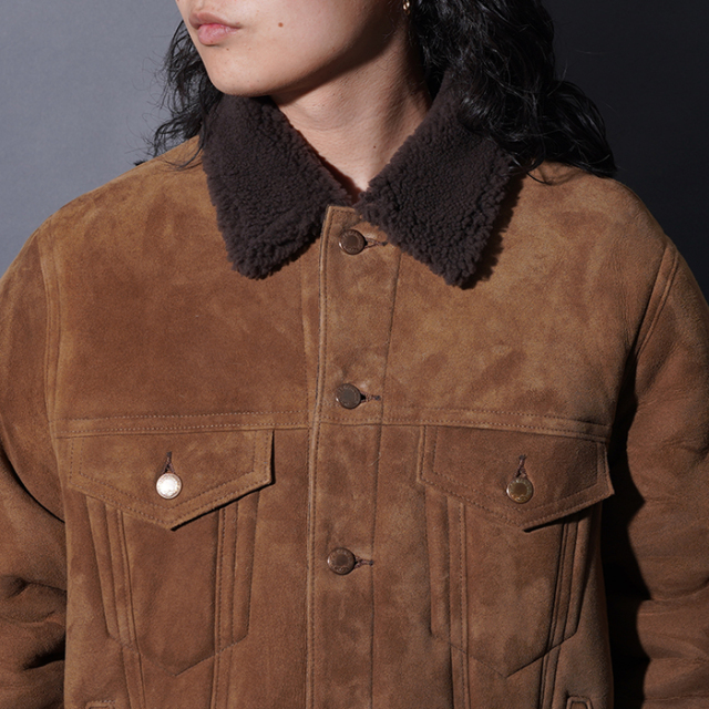 国内工場にてムートンの縫い代をしっかりと抑えた綺麗な縫製で仕上げています。 ムートンの毛を襟、身頃、袖裏と部分ごとに異なる毛の長さにカットし、着心地の良さも考慮して製作しました。ヴィンテージでは珍しいロング丈のトラッカージャケットのサイズ感を参考に、少し余裕を持たせたゆったりとしたサイズ感となっております。 コーディネートを選ばずに羽織れる一着となっています。