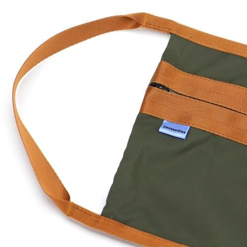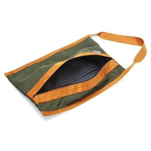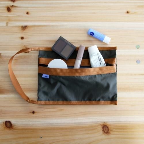 ナイロンの表地に内側はグレーのポリステルを貼り、物を分けて収納できる仕切りを入れています。男女問わず使えるシンプルなデザインで、ファスナー両脇に貼った20mm幅のテープがデザインのアクセントとなっております。