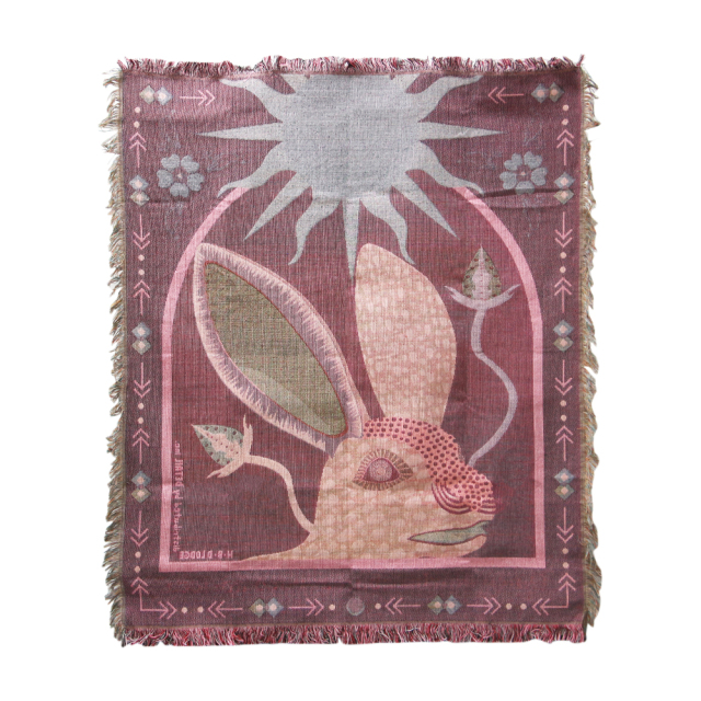 光り輝くメキシコの太陽のもと、自由に跳び回る2023年の干支・兎が描かれています。Quien mucho abarca, poco aprieta(二兎を追う者は一兎をも得ず)と外から窓越しに存在感放つ一兎が貴方を眺めています。