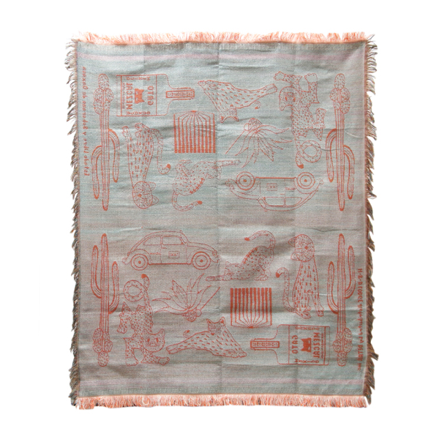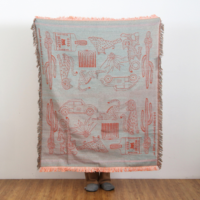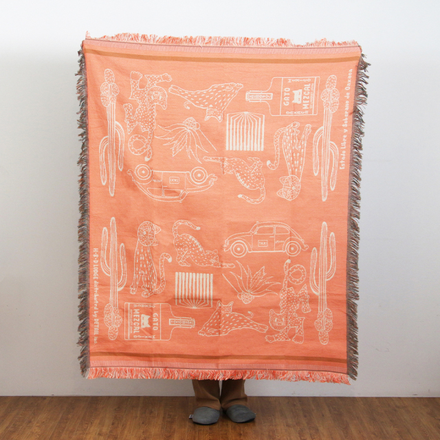 2025年の新柄は、メキシコ原産の蒸留酒である"メスカル"の瓶・タクシー・カクタス・草・木、そして猫。メキシコにまつわるモチーフと緩やかな時間の流れや自由奔放さを、スローケット1枚のなかに表現しました。素材は、ポリエステルの耐久性とコットンの通気性の両方を特性を備えたポリエステルコットン生地。少し厚みがありながらも艶感があり、触り心地の良い通年ご使用いただける生地感です。