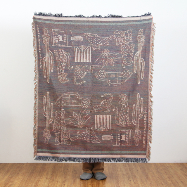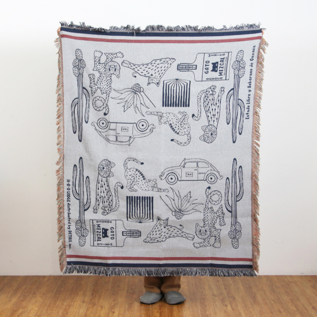 2025年の新柄は、メキシコ原産の蒸留酒である"メスカル"の瓶・タクシー・カクタス・草・木、そして猫。メキシコにまつわるモチーフと緩やかな時間の流れや自由奔放さを、スローケット1枚のなかに表現しました。素材は、ポリエステルの耐久性とコットンの通気性の両方を特性を備えたポリエステルコットン生地。少し厚みがありながらも艶感があり、触り心地の良い通年ご使用いただける生地感です。