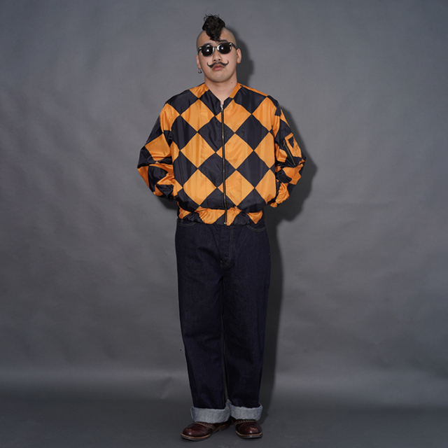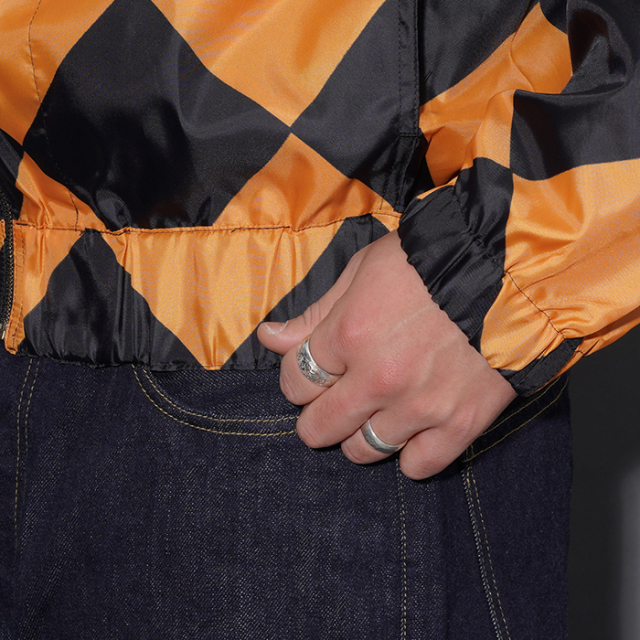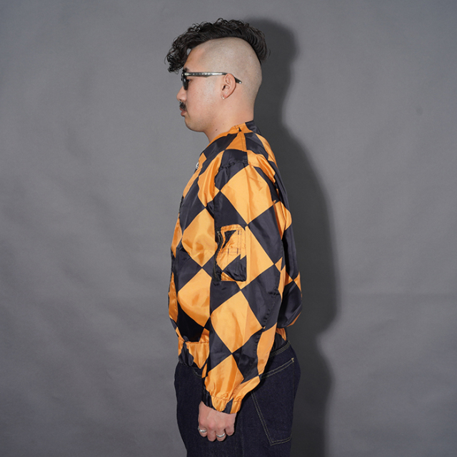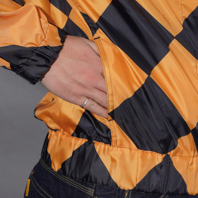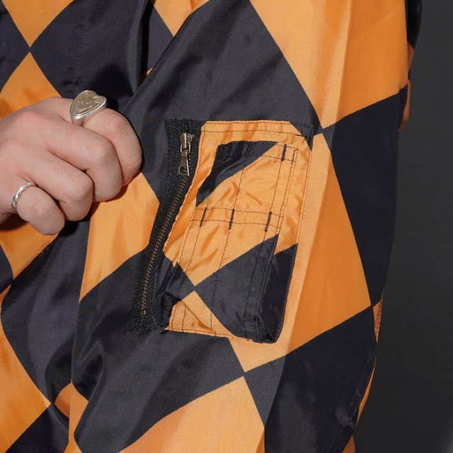 滑走路や飛行場で航空機を整備・誘導するクルーが着用しており、遠目からでも瞬時に視認できるようオレンジ×ブラックのダイヤ柄が全面に施されたインパクトのあるデザインが特徴。