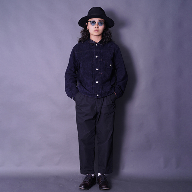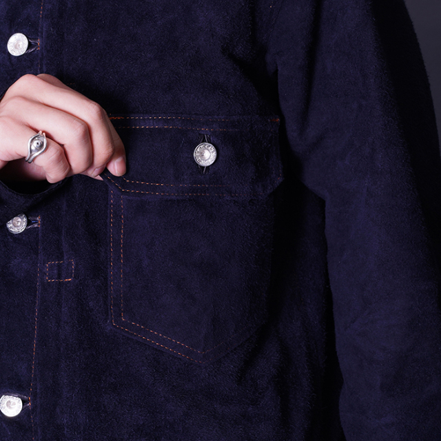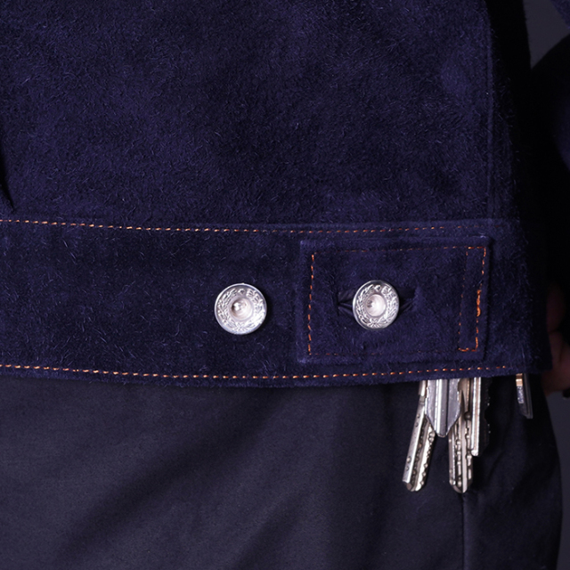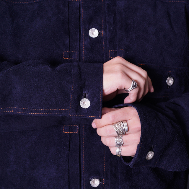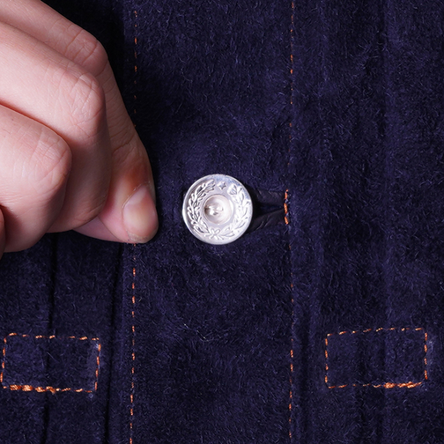 袖もロールアップできますので女性がゆるめのシルエットで着ていただいても良いと思います。今回のモデルから本池が新たに製作したオリジナルの925SV月桂樹ボタンを使用しています。裏の2本針パーツまで全てシルバー製という贅沢な仕様になっています。大人アメカジな印象に仕上がった1着です。