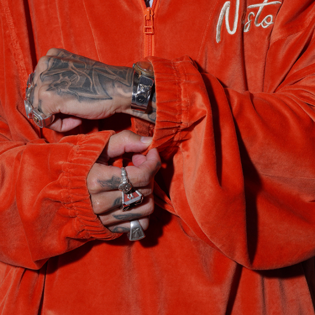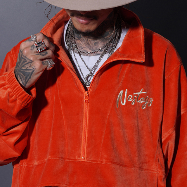 NASTOYSのVelor Track Jacket。中肉で柔らかで極上の肌触りに加え、高いストレッチ性を誇るベロア生地を採用。生地の素材感を主役とする為にディティール等は非常にシンプルに仕上げ、胸元の刺繡、フロントハーフジップ、大きなカンガルーポケットなどが魅力です。ラフながらにタウンユースに取り入れやすい1着です。
