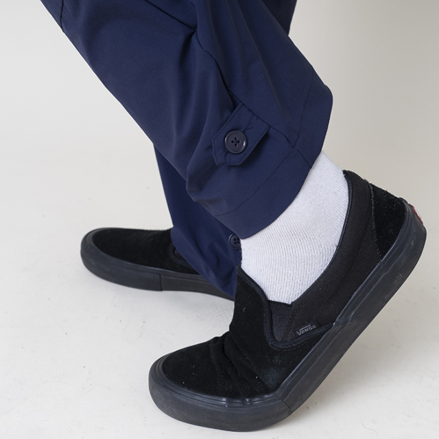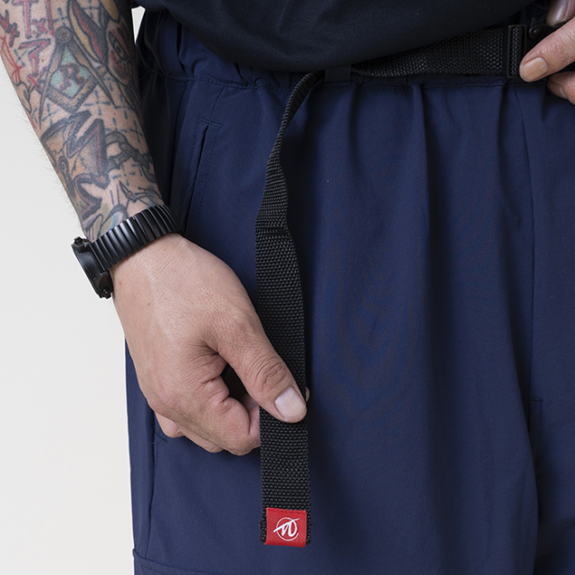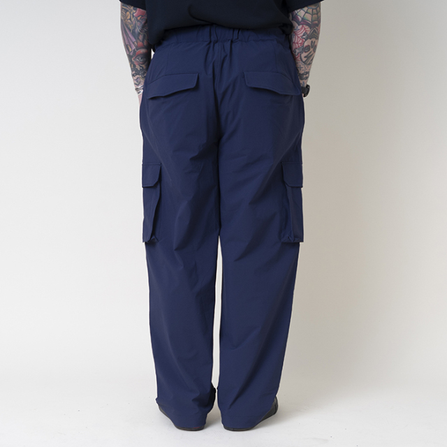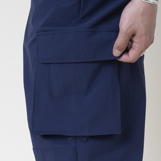 貨物船(カーゴ)で荷役作業などに従事する人たちの間で使われるようになった、作業用のズボンであるカーゴパンツをデザインソースに、特徴的なカーゴポケットや歴史背景を踏まえたヴィンテージディティールを残しながらも、シルエットを現代調にバランスよくリサイズ。ウエストはベルトを搭載したイージーパンツ仕様。生地には、摩耗・引裂・擦り切れに対する耐性の高さが大きな特徴の インビスタ社製コーデュラ糸を使用し、縦横の伸縮性を加え開発された ナイロン91%、ウレタン9%の超高機能素材を使用。更に撥水性とウォッシャブル性も兼ね揃えております。