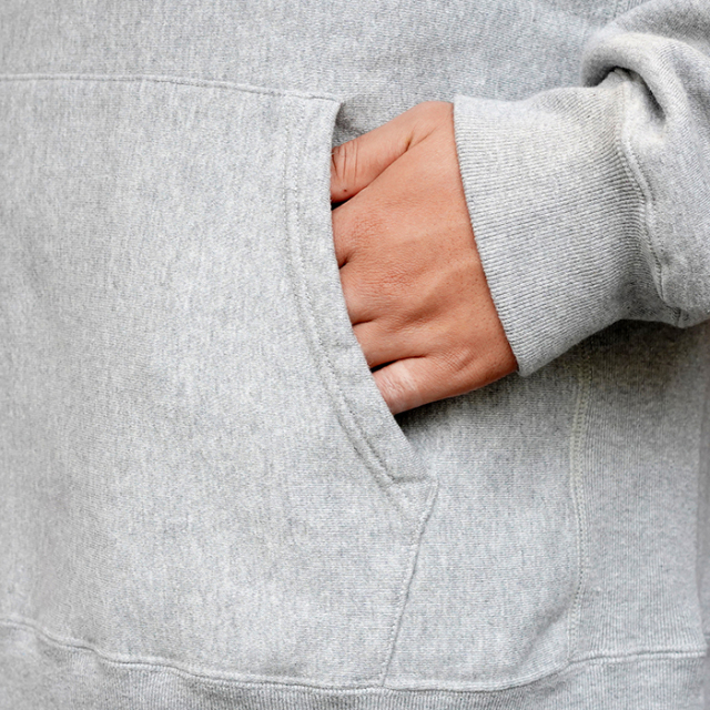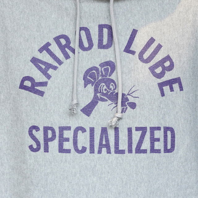 母校やチームのロゴをプリントしたカレッジパーカーをベースに、ネズミがトレードマークのオイルメーカーをイメージした架空のチームロゴを落とし込みました。旧式の編機によって編み上げた30/10裏毛に起毛加工をかけることで、もっちりとした厚みと伸縮性に富んだ柔らかな生地に仕上げています。スウェット生地を横使いし、脇下にリブを配することで洗濯による縦縮みの問題を軽減しています。
