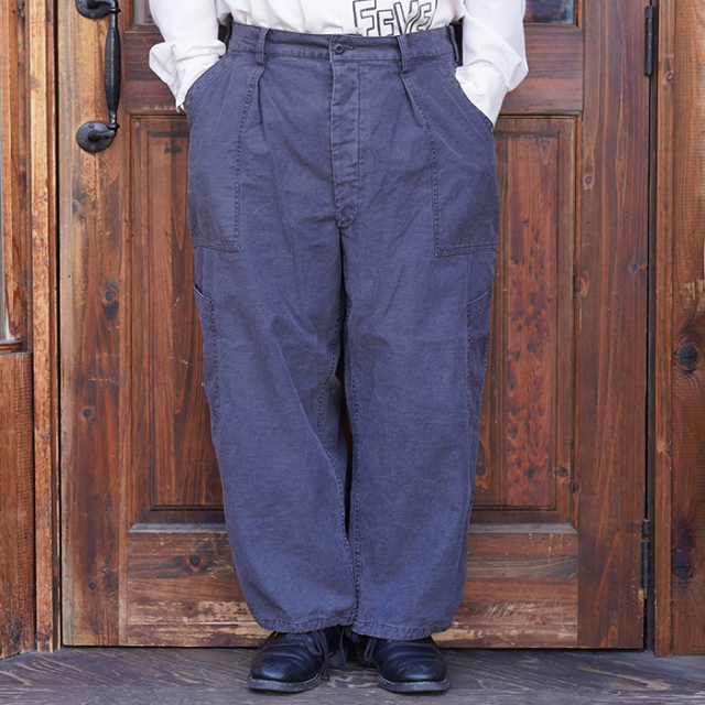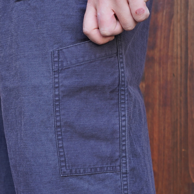 1950年代のU.S.A.F.ユーティリティパンツベースに製作。ゆったり目のワイドシルエットでウエスト背中部をゴムシャーリングにしイージー仕様にアップデートしています。 タック仕様のベイカーポケットやヒップポケット、イージー仕様のベルトや裾口のドローコードが特徴。履き込むことで風合いが増していく硫化染料で染められた、ムラ糸が特徴のバックサテン素材。