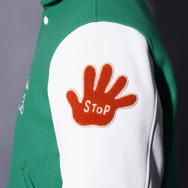 ラウンド衿が特徴的なスタジアムジャケットで、胸、背中、腕に配されたサガラワッペンやフェルトパッチ、チェーン刺繍で表現されたモーターカルチャーを感じさせるグラフィックがポイントとなっている。