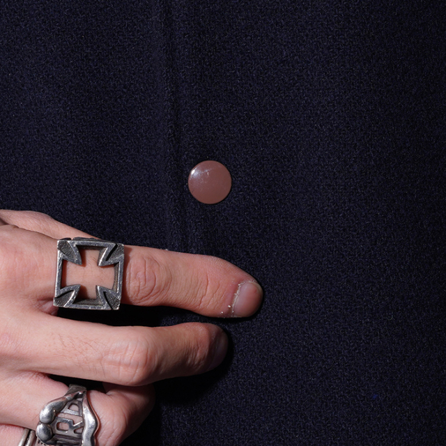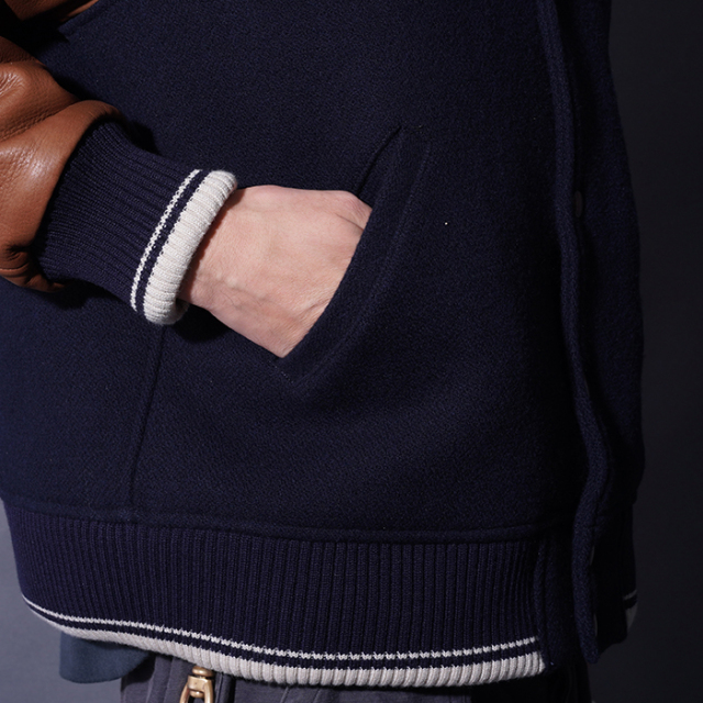 乾いた粗野な雰囲気でヴィンテージライクな二重織ウールメルトン、袖のレザーにはふっくらとした質感と、シボ感が特徴のステアハイドを採用。